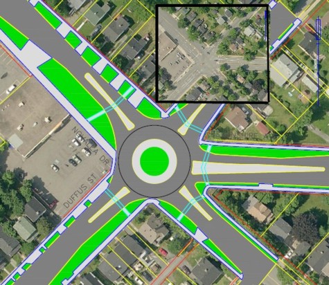 The proposed roundabout at Novalea and Duffus, with the existing intersection shown inset. (Images created by HRM staff.)