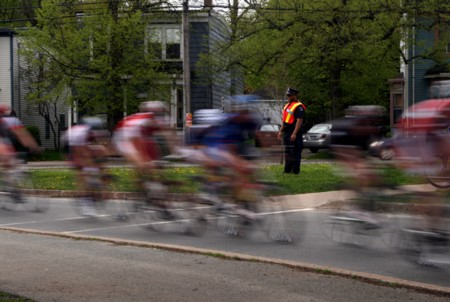 A police officer watches cyclists in the final criterium race at the Halifax Commons on Sunday. After the race, the roadway will remain closed to cars from 2 to 5 p.m. for a public bike-themed street party.