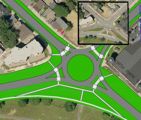 The proposed roundabout at Cunard, Agricola and North Park, with the existing intersection shown inset. (Images created by HRM staff.)